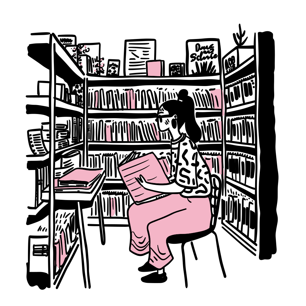 Watercolour illustration of a woman in a hoodie, headband back, sitting at a wooden desk in a sunlit study